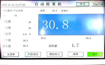 當產品經過計量輸送帶的這段時間內,重量傳感器完成對產品的計量作業并把計量數據顯示到操作部。